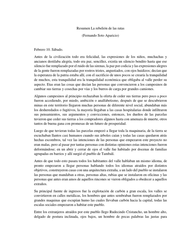 Así el narrador omnisciente se da a la tarea de contar cómo lucía el valle en donde se ubica Timbalí antes de que fuese ocupado y explotado por parte de las fábricas e industrias estadounidenses las cuales trajeron el progreso a la zona. La Rebelión de las Ratas es una novela del escritor colombiano Fernando Soto Aparicio. Resumen La Rebelion De Las Ratas.
